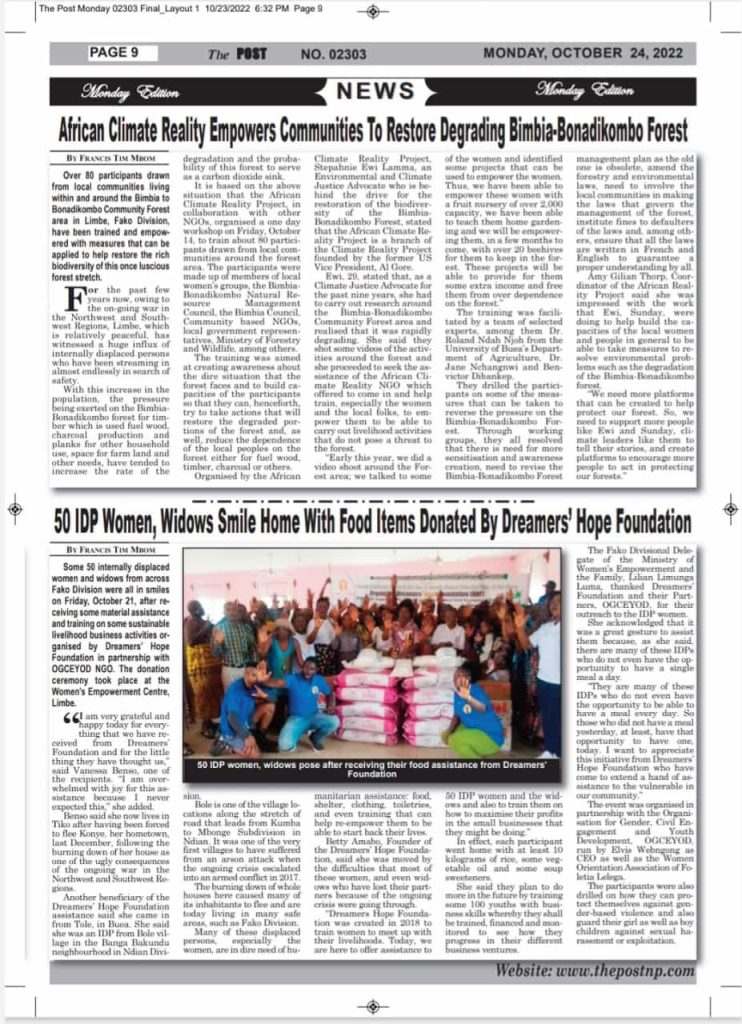 At the end of the registration, the executive director of Dreamers Hope Foundation who talks on the objectives of the organization and the various activities carried out. The presentation ended with an applaud from the beneficiary followed by a talk on Gender base violence (GBV) done by the Delegate of women empowerment center and some members of the Fako Gender Base Violence platform members. Women were educated on what GBV is, types and effect of GBV, women were also taught the different referral pathway in case there are victims of GBV; at the end of the presentation, the floor was open for question and answer. At the end of the question and answer session, the staff commerce with the distribution, beginning from calling out the names of the beneficiaries, each beneficiary had to sign attestation form. At the end, more than 50 beneficiaries where present in the distribution ground. The distribution ended at about1.35pm with a group picture. The process was a success and beneficiaries were happy and grateful for the gesture from Dreamers Hope Foundation and OGCEYOD. |